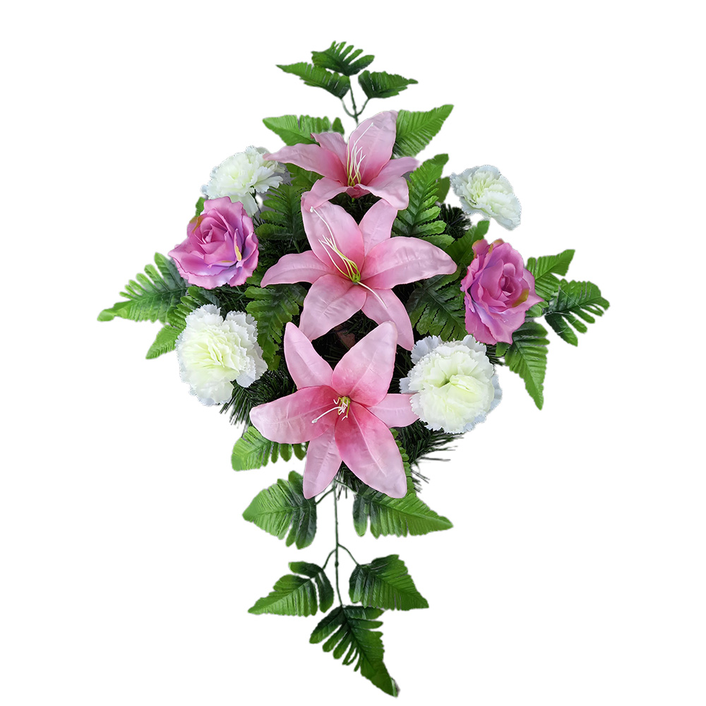 Wiązanka Klaudia to doskonały sposób na szybkie i eleganckie ozdobienie grobu Twoich bliskich. Idealna zarówno na Święto Zmarłych, jak i w pozostałe dni, kiedy chcesz zadbać o pamięć o bliskich Ci osobach. Wszystkie materiały, których użyliśmy do jej przygotowania, są odporne na działanie czynników atmosferycznych. To oznacza, że ta kompozycja kwiatowa przez długi czas będzie wyglądała równie pięknie, jak w dniu jej położenia na cmentarzu. Wiązanka Klaudia została wykonana na podkładzie sztucznym tzw. miska na 25 otworów z wykorzystaniem najwyższej jakości sztucznych kwiatów.
