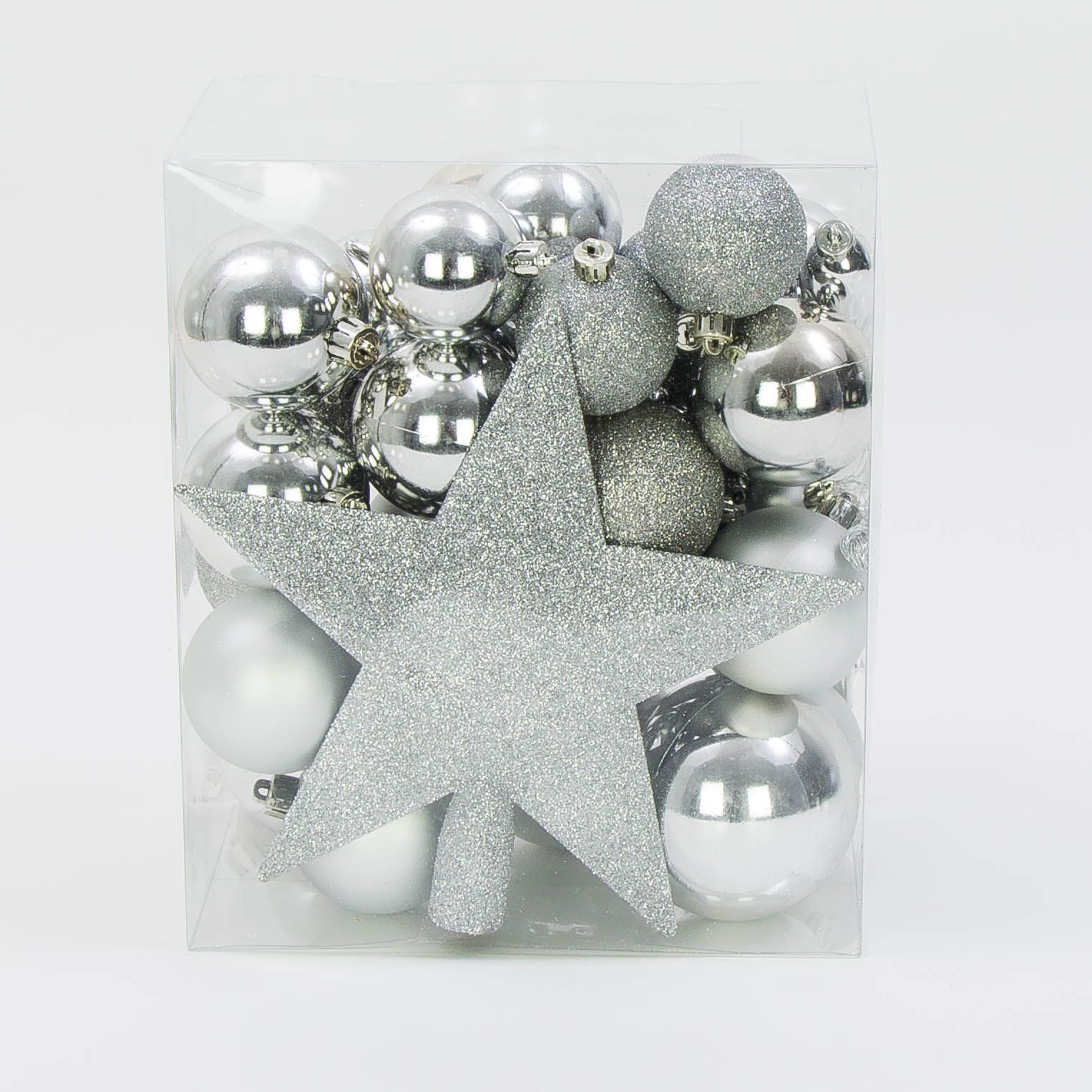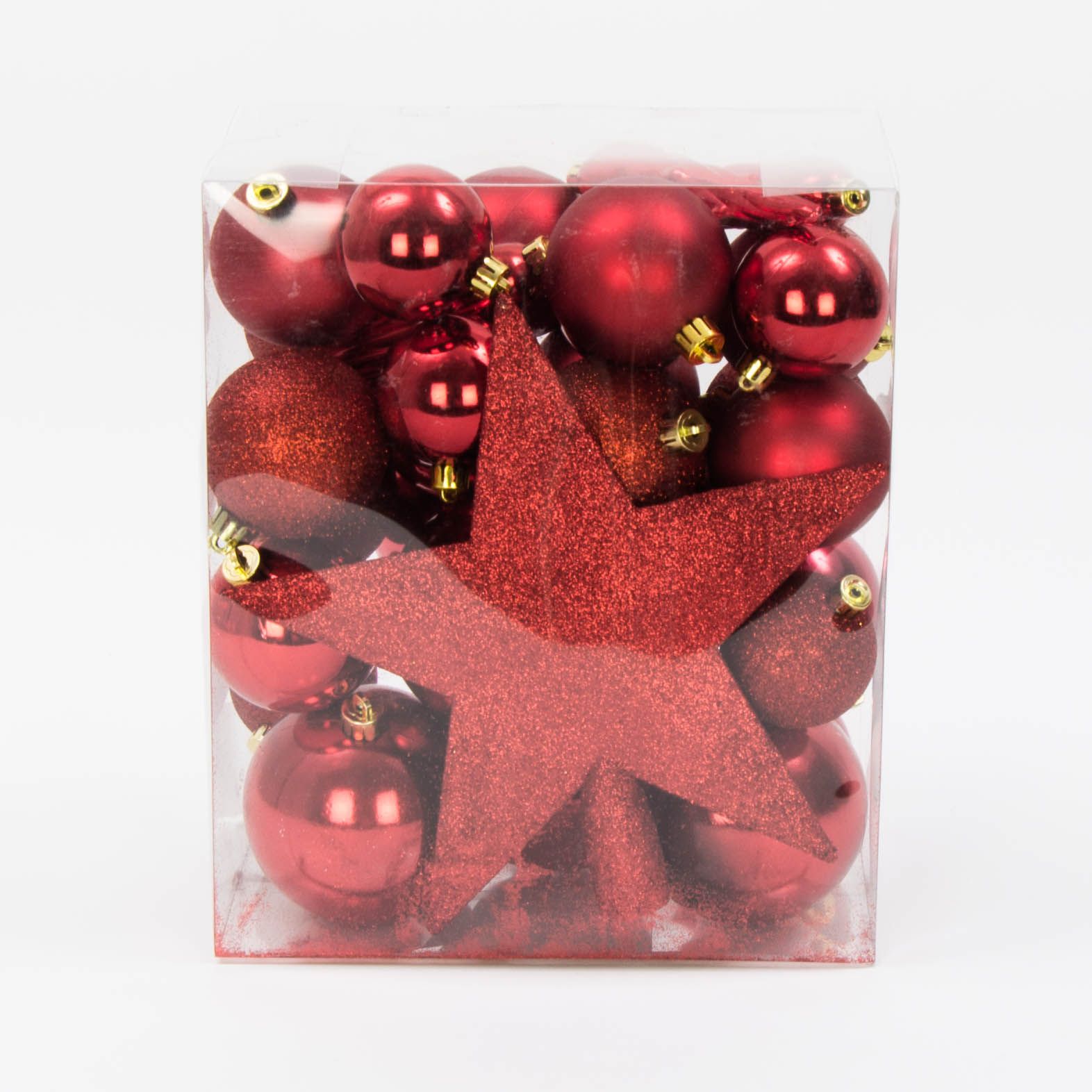 Wymiary bombek: 7 cm – 4 szt. | 5,5 cm – 18 szt. | 4 cm – 7 szt. | sopel 12 cm – 3 szt. | gwiazda – 22 cm.